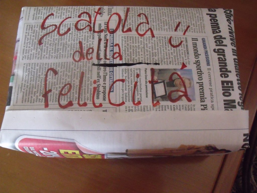 Da qui l’idea: perché non lanciare un gruppo in cui condividere ciò che di bello ci accade, in cui allenarci ad essere felici? Una canzone, una frase, un’iniziativa: tutto può aiutare a trovare un senso a quello che succede, un motivo per andare avanti. E così ho cominciato, lanciando gli esercizi settimanali della felicità, piccoli gesti quotidiani che fanno bene al cuore per rendere migliore ogni giorno. Il primo? La scatola della felicità, in cui riporre ogni sera un bigliettino con scritta una o più cose che ci hanno reso felici durante la giornata. Come costruirla? È molto semplice. Io per esempio ho preso una scatola delle scarpe, ho tagliato una fessura centrale a mò di salvadanaio e poi l’ho ricoperta con un foglio di giornale, per ricordarmi sempre chi sono e dove voglio arrivare. In breve tempo, su Facebook sono arrivate le foto delle scatole costruite da amiche e conoscenti, ognuna personalizzata ad arte, per esprimere la personalità della proprietaria.