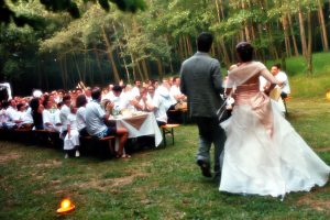 D.: “Il nostro matrimonio è stata un’altra avventura. Non volevamo una festa classica, poichè sentivamo che non ci apparteneva. Visto l’amore per l’Irlanda di Heidi e la mia passione per i Balcani, alla fine abbiamo optato per una festa danzante, con violinisti e birra alla spina, circondati da un fitto bosco. Nessuna tensostruttura. Nessun piano B. Siamo stati fortunati e i nostri ospiti hanno cenato a lume di candela, accompagnati da musica irlandese e balcanica sotto un cielo pieno di stelle. Gli ospiti indossavano un abbigliamento informale ed io ero vestito con un completo di lino. Heidi invece indossava un abito da sposa etereo, degno di una fata. Siamo molto legati al ricordo di quel giorno, alla luce calda e avvolgente e alla gioia con cui abbiamo brindato aprendo una magnum di birra belga!”.